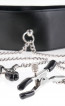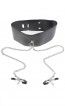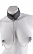 Con ogni movimento, i morsetti tirano fornendo ogni volta la giusta quantità di stimolazione. Il collare in pelle è dotato di un anello resistente per collegare il guinzaglio con un cinturino a fibbia per regolare. I morsetti per capezzoli sono collegati all’anello da una catene metalliche e presentano rivestimenti in gomma.