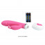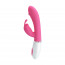 Vibratore ricaricabile rosa. Ha uno stimolatore clitorideo a forma di coniglietto. Il materiale è silicone. Ha 30 modalità di vibrazione, il controllo avviene tramite pulsanti touch alla base.