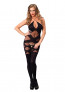 Tutina nera, effetto vedo non vedo, con ampia scollatura davanti e dietro e con apertura inguinale.